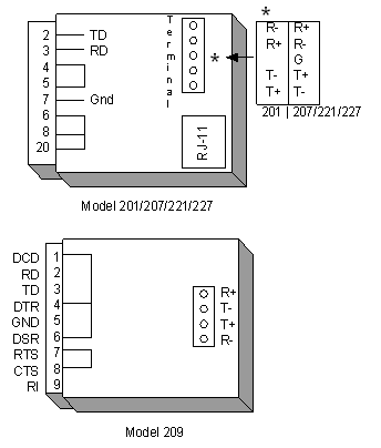 members of the other pair. The Model 201/209FT is supplied with four screw terminals marked T+, T-, R+ and R-. The Model 207/221/227 is supplied with five screw terminals marked T+, T-, R+, R- and GND. When connecting two line drivers together the T+ terminal of one unit goes to the R+ terminal of the other; the T- terminal goes to the R- terminal. 3.2.2 Phone Plug The Model