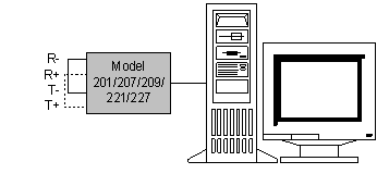 If the unit is believed to be defective, operation can be verified if one of the devices to which the modems are attached is capable of operating in a full-duplex mode (e.g., a terminal or a PC using a communications package such as Procomm). Connect the Model 201/207/209/221/227 to the terminal via the RS-232 connector and make the following loopback connections at the analog interface: T+ to R+ and T- to R- If the modem is functioning correctly, any data entered on the keyboard should appear on the screen. |