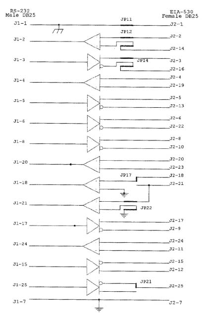 3.2.2 Data Signal Phasing for Model 62-1 The phasing of the control signals is different for the Model 62-1 than it is for the Model 62-2. The phase of the LL (J1 - Pin 18, J2 - Pin 18) and RL (J1 - Pin 21, J2 - Pin 21) signals for the Model 62-1 are affected by the shunts located at jumpers JP 16 and 17 on the main PC board and JP 23 on the upper board. The shunts allow user-selection of the phase of the signals on Pin 18 and 21 of the EIA-530 interface as well as selecting the source of those signals. There are two EIA-530 driving circuits involved with these signals. The normal configuration of the converter associates Pin 18 of each connector with each other as well as Pin 21 of each connector with each other. Refer to Appendix A, "Block Diagram for Model 62-1" or Appendix B, "Block Diagram for Model 62-2" to determine operation in other than the factory-set configurations. We do not recommended having a shunt located in JP 14 - Pin 4 and on JP 23 at the same time. This puts two drivers on J2 - Pin 21. The relative phasing of the TM signal (J1 - Pin 25